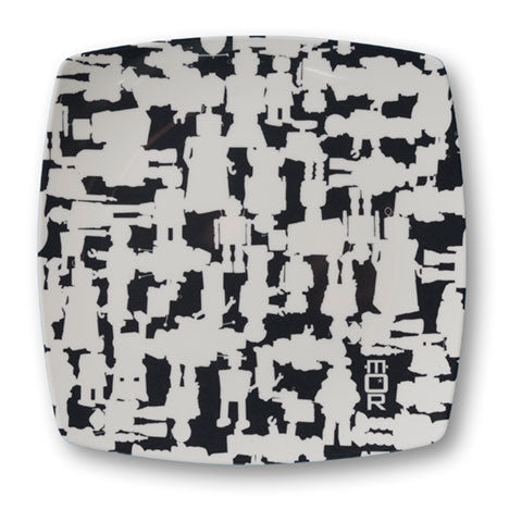 Welcome robots to your table with this robot-motif dinnerware, available in the black-and-white set, and the kids-chasing-robots set.