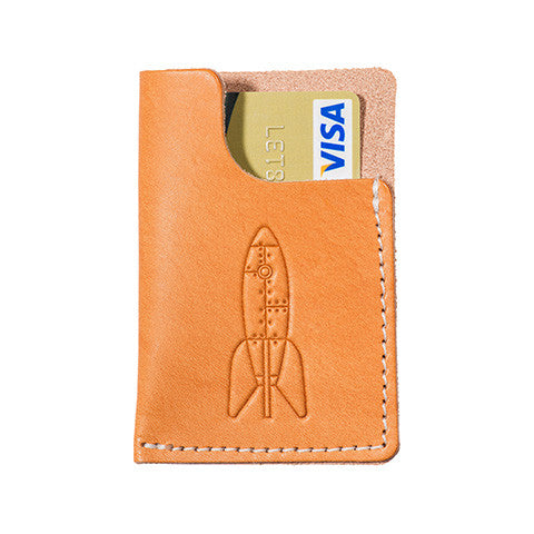 Premium leather, slim card wallet is a folded with a curved cutout for easy card access. Foil stamped with Rocket design. Reverse is stamped with "Museum of Robots, Made in USA". Folded and sewn with matching thread.