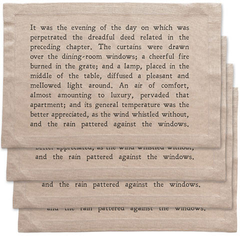 Our set of four placemats will bring both style and literature to your table. The text is a paragraph from "The Mysteries of London" by George W.M. Reynolds, a long-running Victorian serialized story, or 'penny dreadful'.